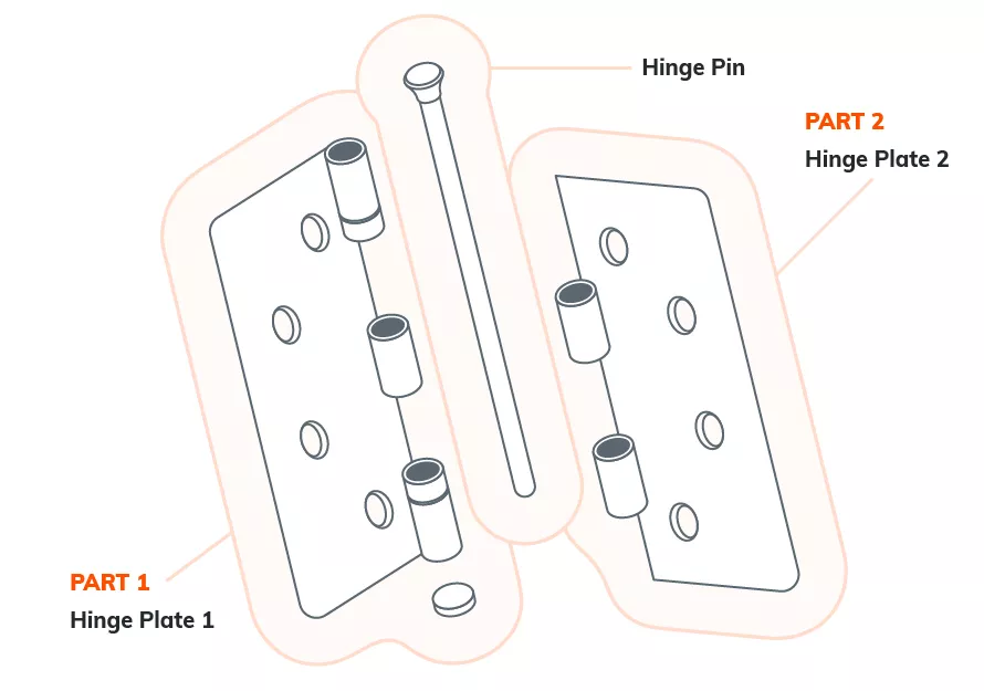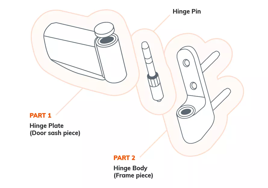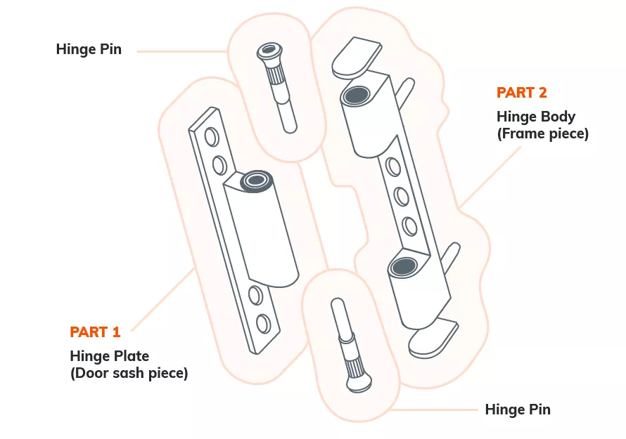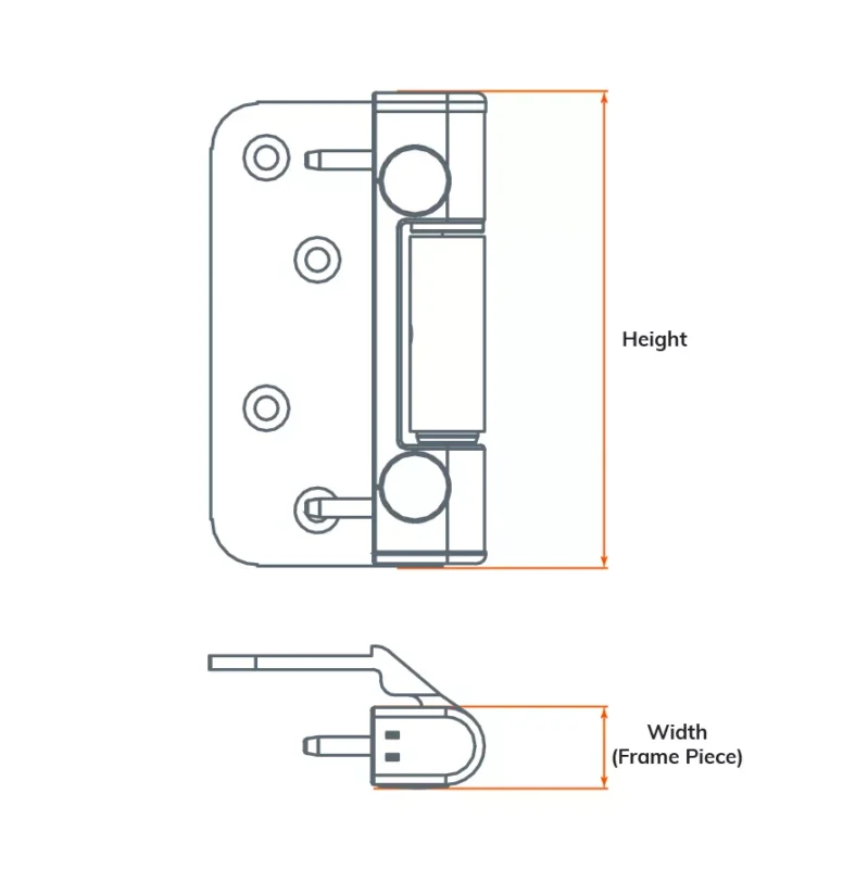 Flag hinges consist of 2 main parts, as described above. The hinge plate (connects to the door sash) and the hinge body (connects to the door frame).