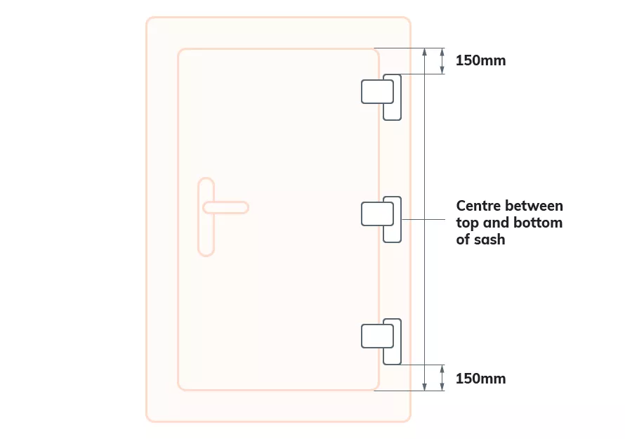 Typically, a standard door requires x3 hinges. The top hinge should be located 150mm from the top of the sash, the bottom hinge should be located 150mm from the bottom of the sash, and the middle flag hinge should be positioned at an equal distance centrally between the top and bottom of the sash.