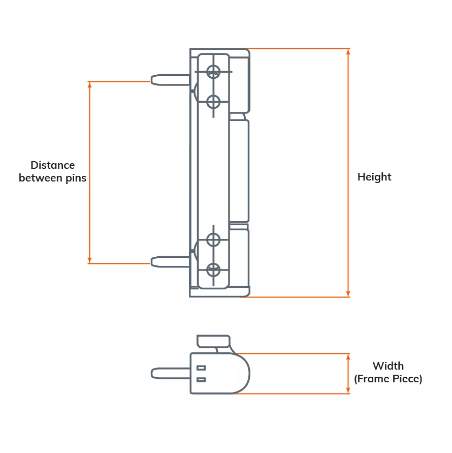 - Distance between pins: the distance between the two pins on the hinge body. This is important to know if you are replacing an existing hinge.
